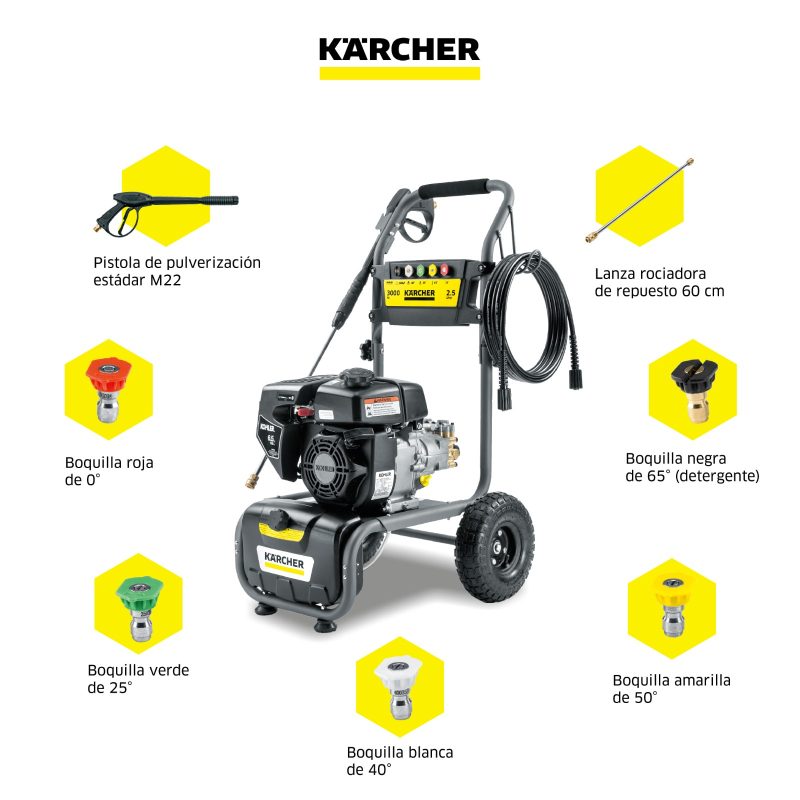 La hidrolavadora a gasolina Kärcher G 3000 es una máquina de alto rendimiento diseñada para enfrentar los trabajos de limpieza más exigentes en entornos donde la movilidad y la potencia son cruciales. Equipada con un robusto motor de combustión interna Kärcher KXS de 196 cc, esta hidrolavadora ofrece una impresionante presión de 3000 PSI y un caudal de agua de 9 litros por minuto, garantizando la eliminación eficaz de suciedad arraigada en una amplia variedad de superficies.